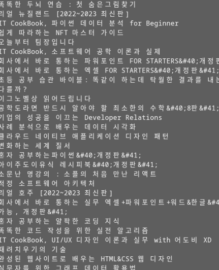 mkdir '폴더이름' cd '폴더이름' # 한빛미디어 도서목록 가져오기(다운로드) wget https://www.hanbit.co.kr/store/books/full_book_list.htm # 다른 파일로 저장할 경우(test.txt) wget https://www.hanbit.co.kr/store/books/full_book_list.htm -q -O test.txt # 원하는 텍스트만 추출 후 공백제거하기 cat full_book_list.html | grep '<a href="/store/books/look.php' |sed -E 's/<[^>]*>//g' | sed -E 's/^\s*//'<결과>