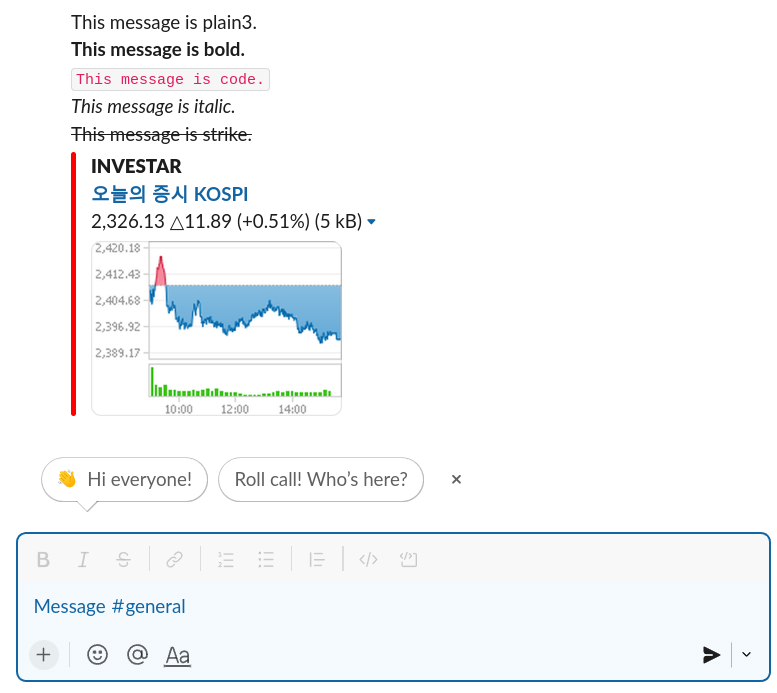슬랙API로 메시지를 보내려면 외부 라이브러리 slacker가 필요하다. pip install slacker로 설치한다.(2021.2.24 이후로 새로 생성된 bot은 slacker 라이브러리를 이용할 수 없다고 한다.)import requests import json def post_message(token, channel, text, attachments): response = requests.post("https://slack.com/api/chat.postMessage", headers={"Authorization": "Bearer "+token}, data={"channel": channel,"text": text, "attachments": attachments} ) print(response) myToken = "xoxb-발급받은 Bot User OAuth Token 입력" markdown_text = ''' This message is plain3. *This message is bold.* `This message is code.` _This message is italic._ ~This message is strike.~ ''' attach_dict = [{ 'color' :'#ff0000', 'author_name':'INVESTAR', "author_link":'github.com/investar', 'title' :'오늘의 증시 KOSPI', 'title_link' :'http://finance.naver.com/sise/sise_index.nhn?code=KOSPI', 'text' :'2,326.13 △11.89 (+0.51%)', 'image_url' :'https://ssl.pstatic.net/imgstock/chart3/day/KOSPI.png' }] attach_list = json.dumps(attach_dict) # json 객체로 변환하기 post_message(token=myToken,channel="#general", text=markdown_text, attachments=attach_list)스마트폰에 slack 어플을 설치하거나 웹브라우저(https://app.slack.com/)에 접속하여 Investar 워크스페이스로 가면 #general 채널에 송신한 메시지가 수신된 것을 볼 수 있다.