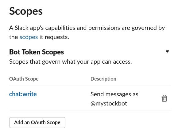 슬랙 API를 활용하면 사용자에게 알림 메시지를 보낼 수 있다. 이 기능을 활용하면 매매 체결 내역, 시스템 에러 상황 등을 알려줄 수 있다. 또한 주기적으로 계좌 잔고를 보내주거나 주가가 등락할 때 알림 메시지를 보내주는 등 활용할 수 있다. 슬랙 홈페이지에 접속하여 계정을 생성한다. (www.slack.com) 가입과 동시에 workspace를 생성하는데 여기에선 Investar의 이름으로 만든다. 그리고 슬랙API 홈페이지로 이동한다. createapp을 눌러 생성 후 features>oauth&permissions 메뉴를 클릭한다. add an OAuth Scope 를 눌러 chat:write를 선택한다.