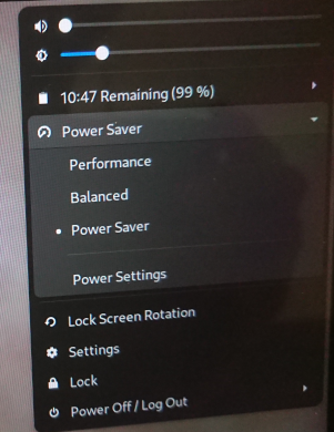 전원 설정 바탕화면 우측상단을 클릭하면 전원설정이 나오는데 기본 세팅은 Balanced로 되어 있다. 이 상태에서 프로그램 설치, 인터넷 서핑 등 다소 가벼운 작업만 했는데도 체감상 2~3시간정도 후에 배터리 충전하라는 경고알림이 떴다.(이 때즈음 빌트인 펜도 배터리가 방전되어 작동하지 않음) 유선 USB LAN 카드에 발열이 있는 것으로 보아 전원을 많이 잡아먹었는지는 모르겠지만 한번 충전시 최대 9.8시간은 다소 과장되지 않았나 싶다. 절전모드(Power Saver)에 놓고 사용하면 약 10시간 사용이 되는데 이건 프로그램을 아무 것도 띄우지 않았을 때 기준이고 Balanced로 바꾸면 5~6시간으로 줄어든다. 아마 커널 업그레이드 등 최적화가 되면 좀 더 배터리 시간이 늘어나지 않을까 생각한다. 그리고 충전 시간은 1시간 내외로 무척 빠른 것 같다. 경고 알림이 뜨고 충전하기 시작해 1시간도 채 되지 않아 완충된다.